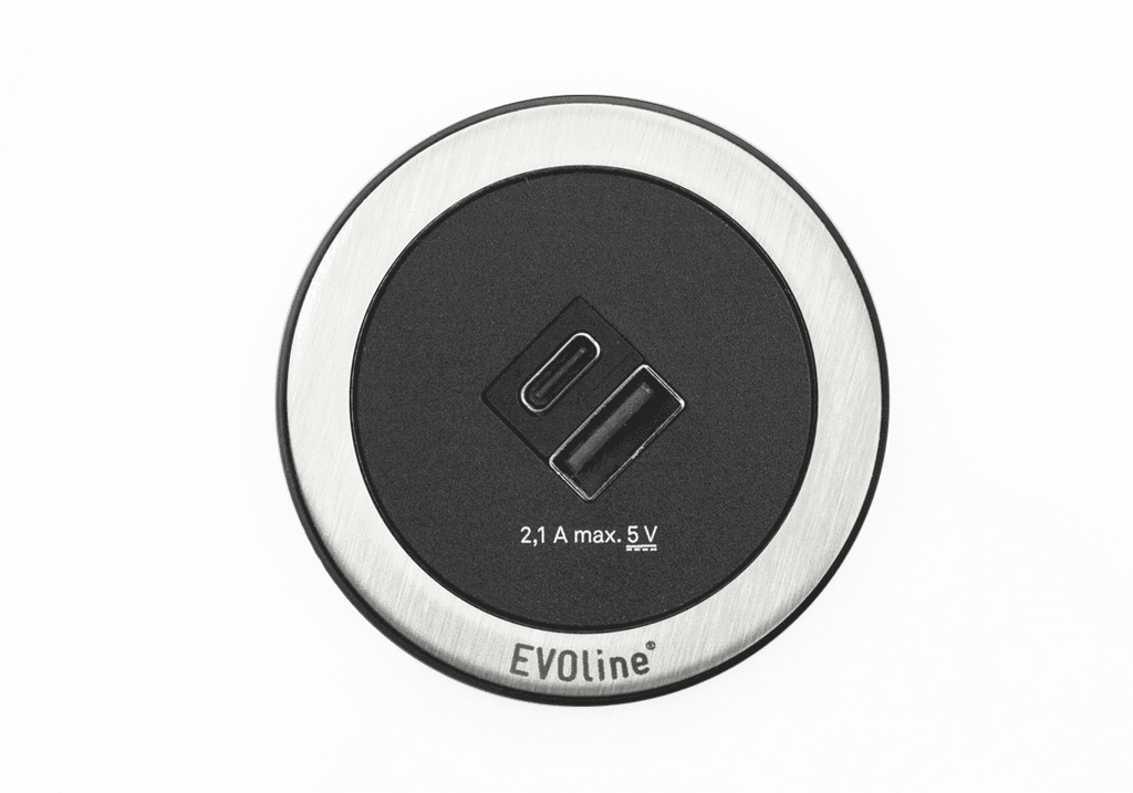 EVOline One USB-Charger USB-Charger für alle gängigen Smartphones und Tablets. 1 x USB-A und 1 x USB-C Stecker 5 V DC / 2,1 A / 10,5 W, mit Uni-Schutzkontaktstecker, Gehäuse aus Kunststoff schwarz, Blendenring in Edelstahl und Kunststoff schwarz, Einbaubohrung: 54 mm Durchmesser, Einbautiefe: 50 mm, 2500 mm Netzanschlusskabel. Zur horizontalen oder vertikalen Montage. Jedoch ohne Stecker.