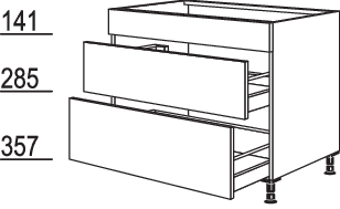 Flex 21 1 Innenblende, 1 Schubkasten mit Auszugsblende, 400 mm tief, mit Holzrückwand für bauseitige Siphon-Aussparung,unterer Auszug, 400 mm tief, mit Metallrückwand und Mülltrennsystem Flex 21: 2 x 13 Liter, 2 Eimerdeckel